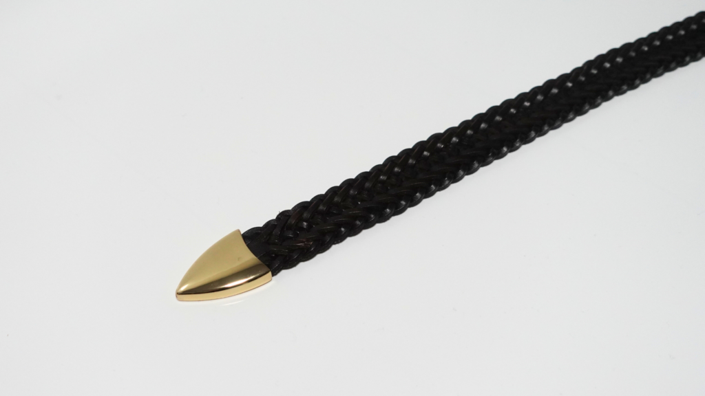 バックル、留め具、ベルトの先(テール)の三点に金具があしらわれ、高級感が漂います。