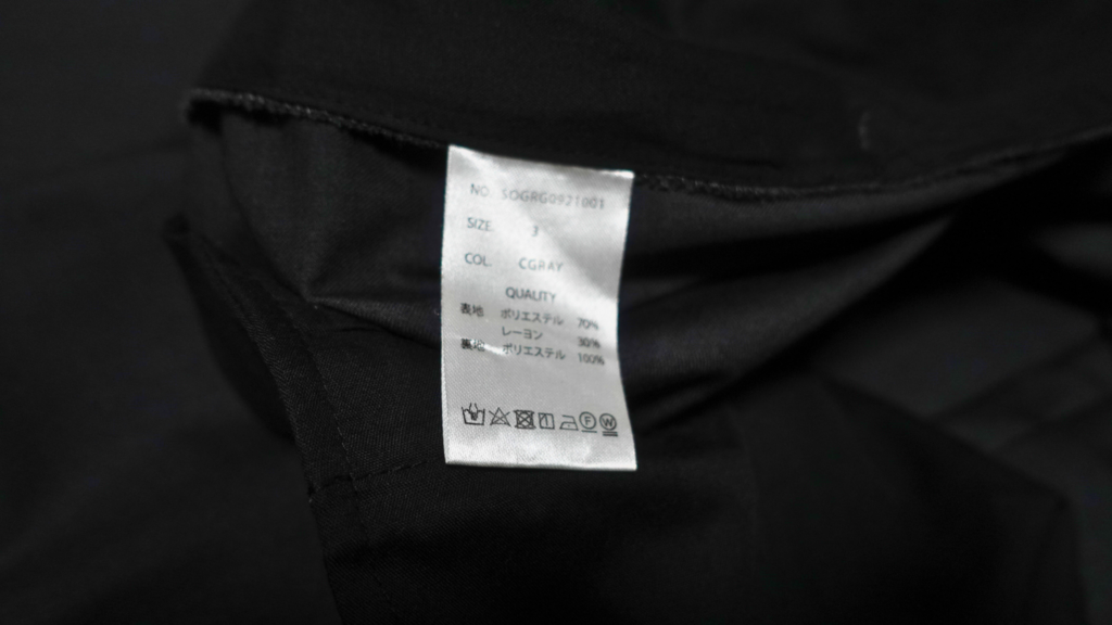 綾織のウールライクな生地ですが手に取ると若干の起毛感があり、しっとりとしています。そしてグレーの若干光沢のある風合い。これがいかにもポリエステル感があります。