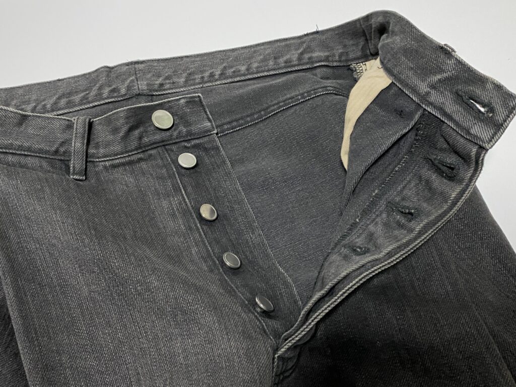 フロント部分はボタンフライです。Levis 501などにも見られる仕様ですね。ボタンには特に刻印等はありませんが、大きさが丁度良く、デニム生地も固すぎないので留めやすいです。